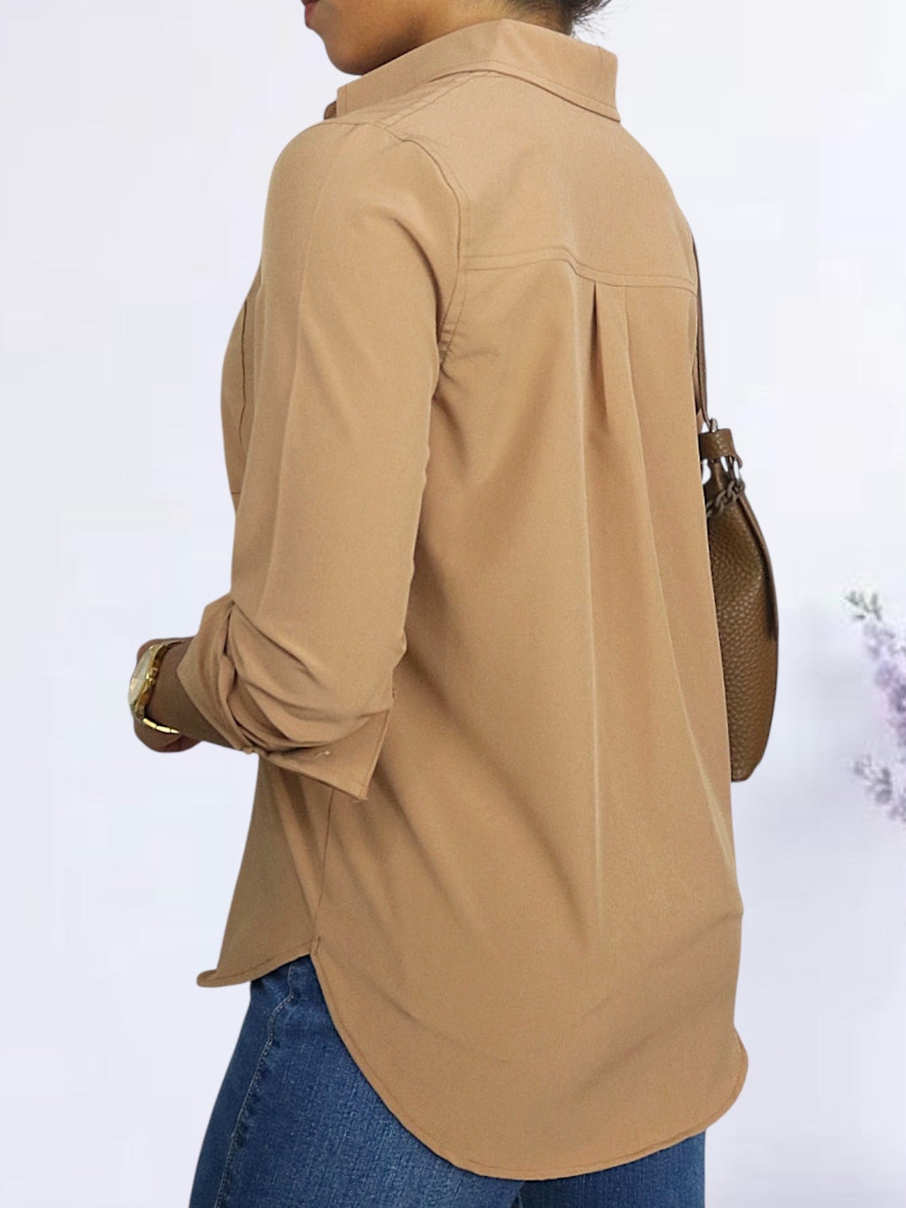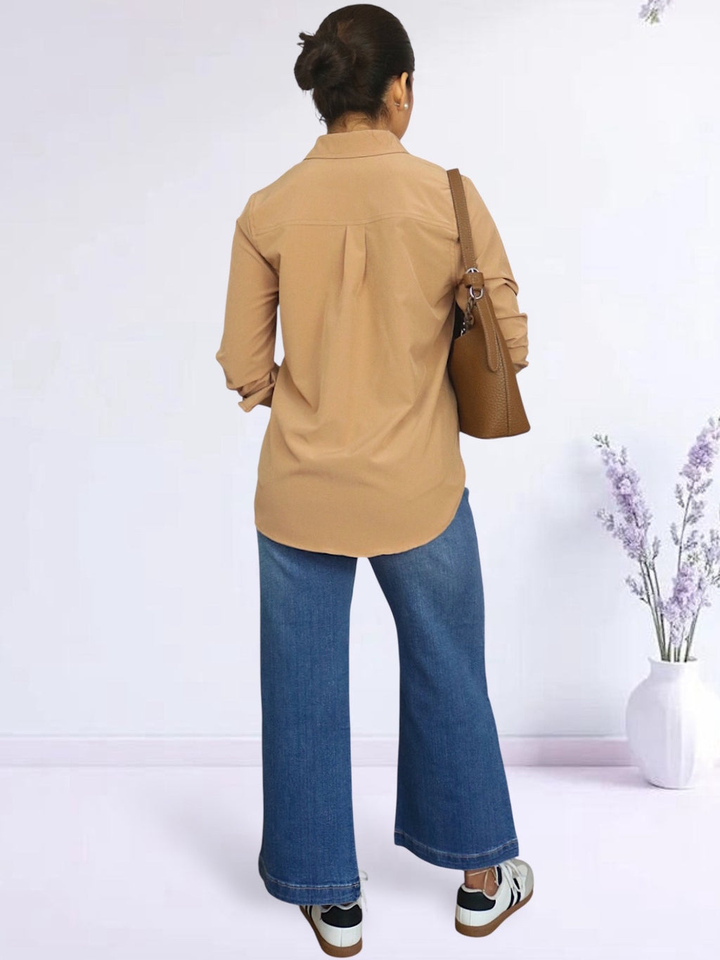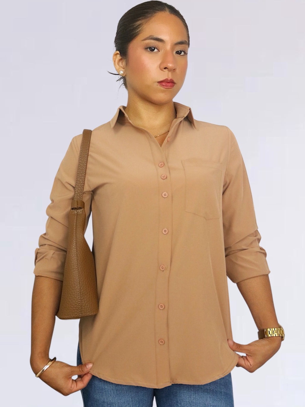 Maxicamisa elaborada en tela de seda, con un estilo suelto libre de pinzas. Viene con ojales y botones, así como un bolsillo delantero.