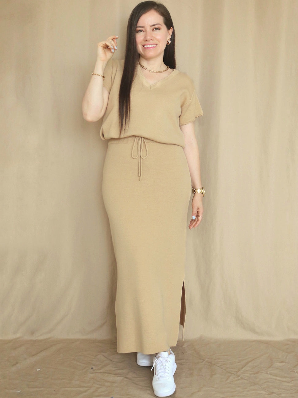 Maxifalda con tejido Jackard, con remalle doble puntada, en hilo tacto algodón con aberturas a cada lado. Puedes usarla con sandalias planas o de taco, botas, botines, stilettos, mules y zapatillas.