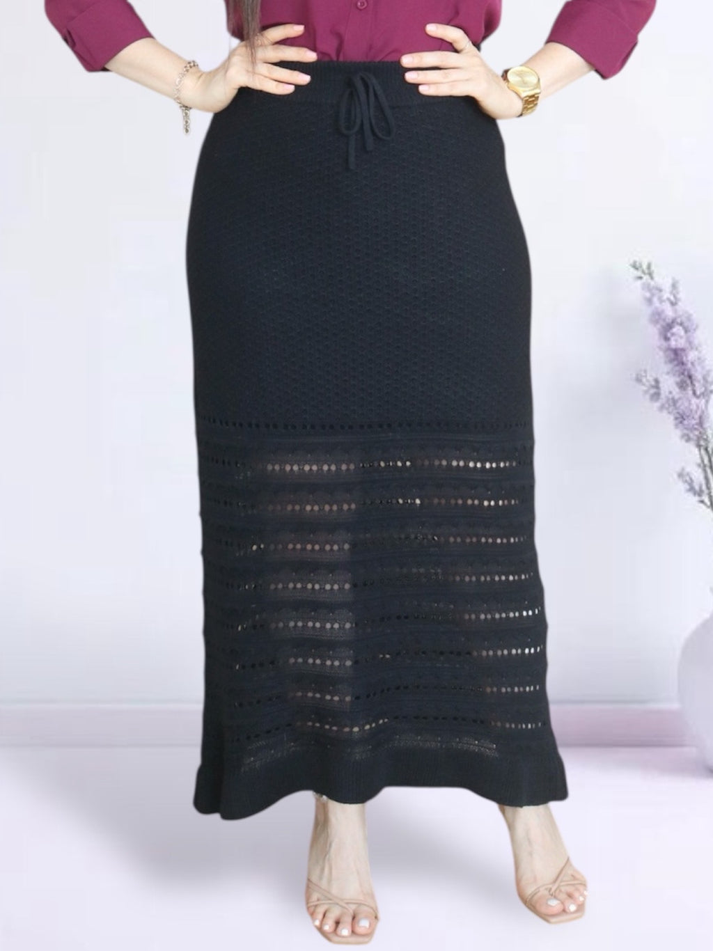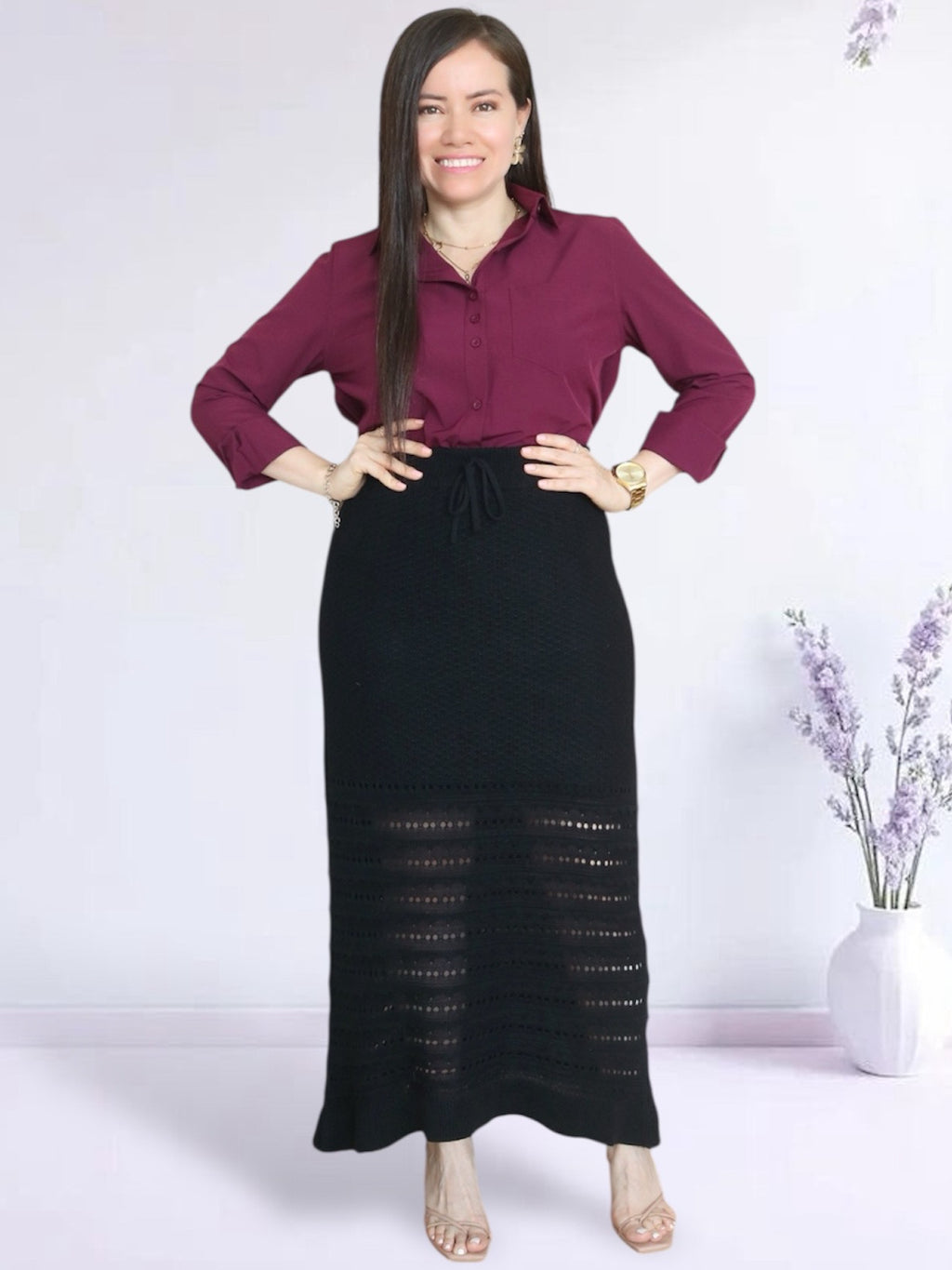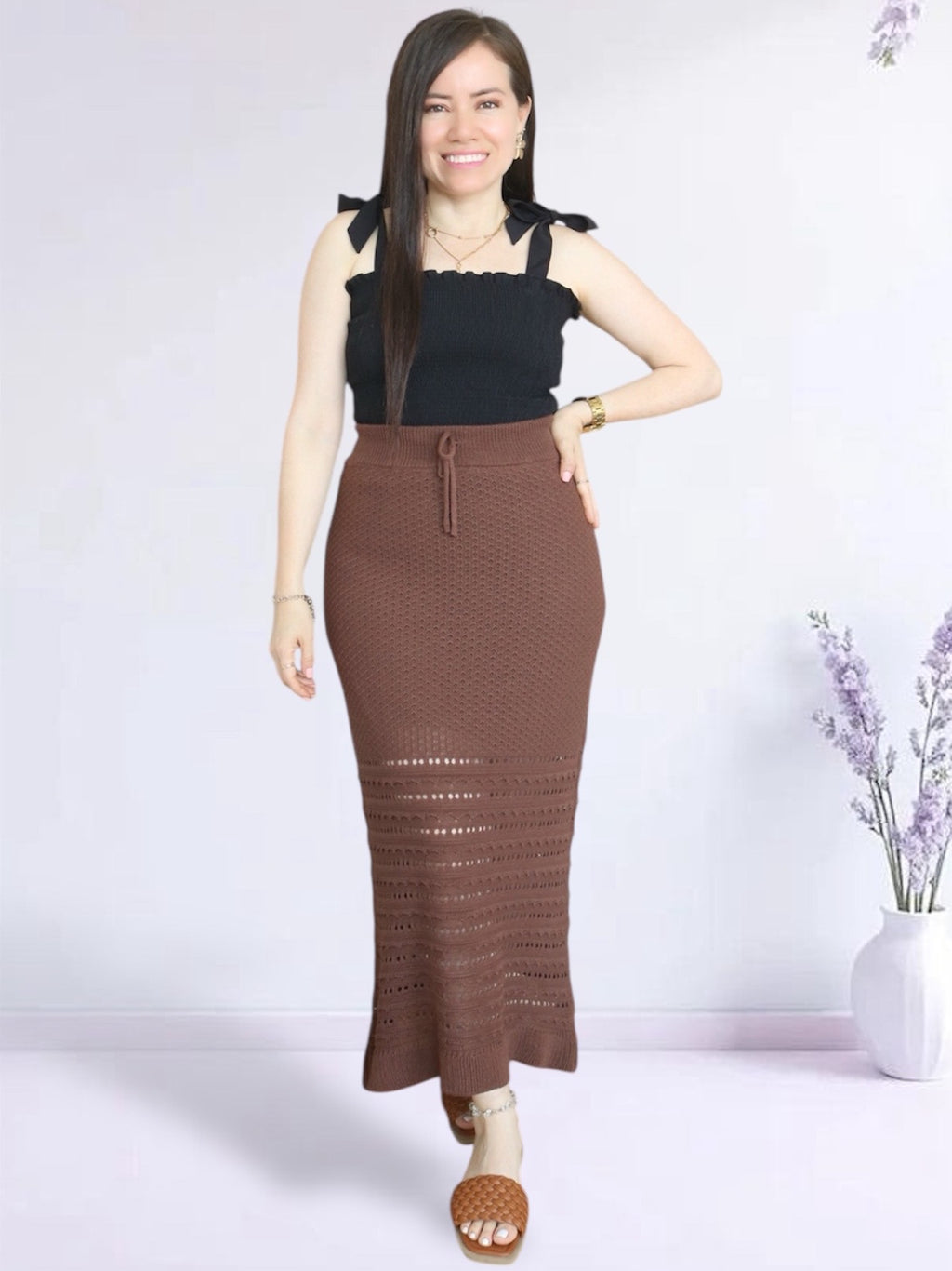 Maxifalda con tejido calado, en hilo tacto algodón sin aberturas. Viene con forro hasta antes de las franjas. Puedes usarla con sandalias planas o de taco, botas, botines, stilettos, mules y zapatillas.