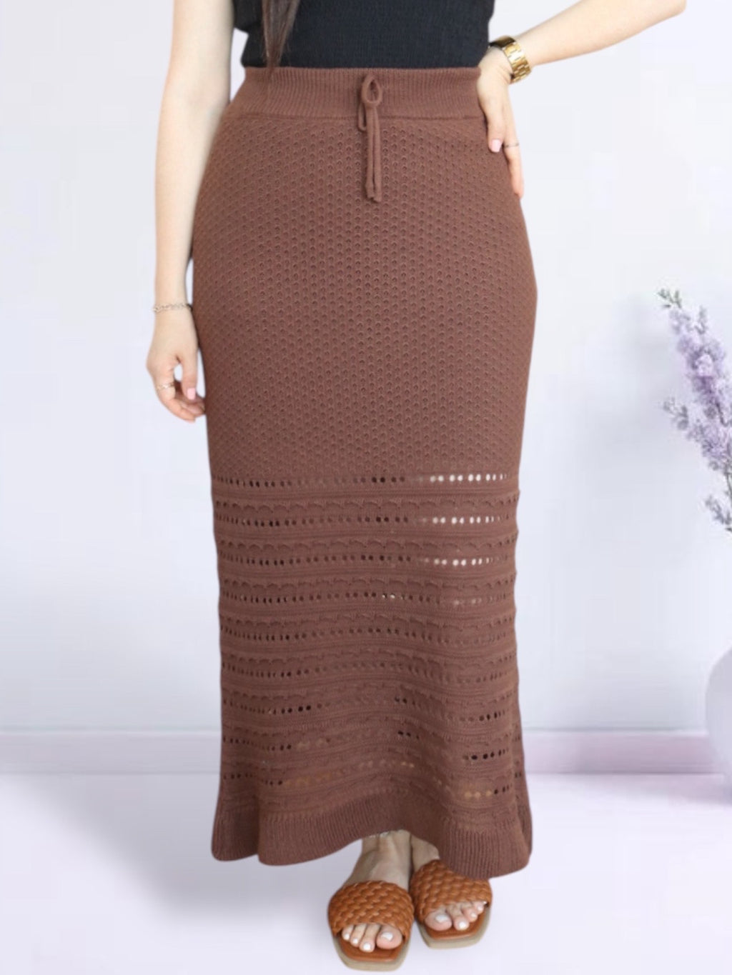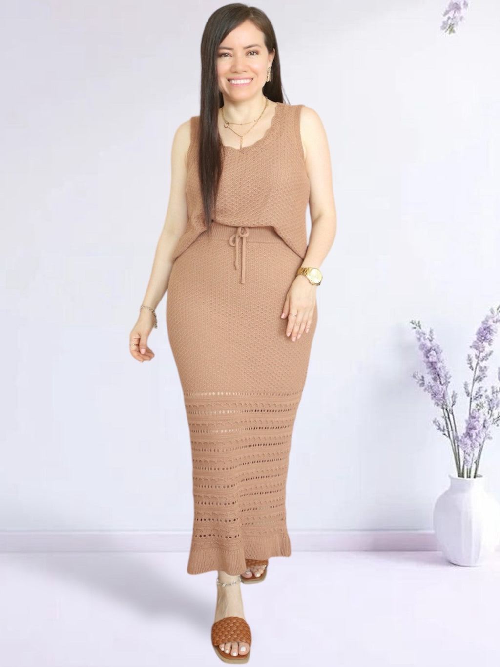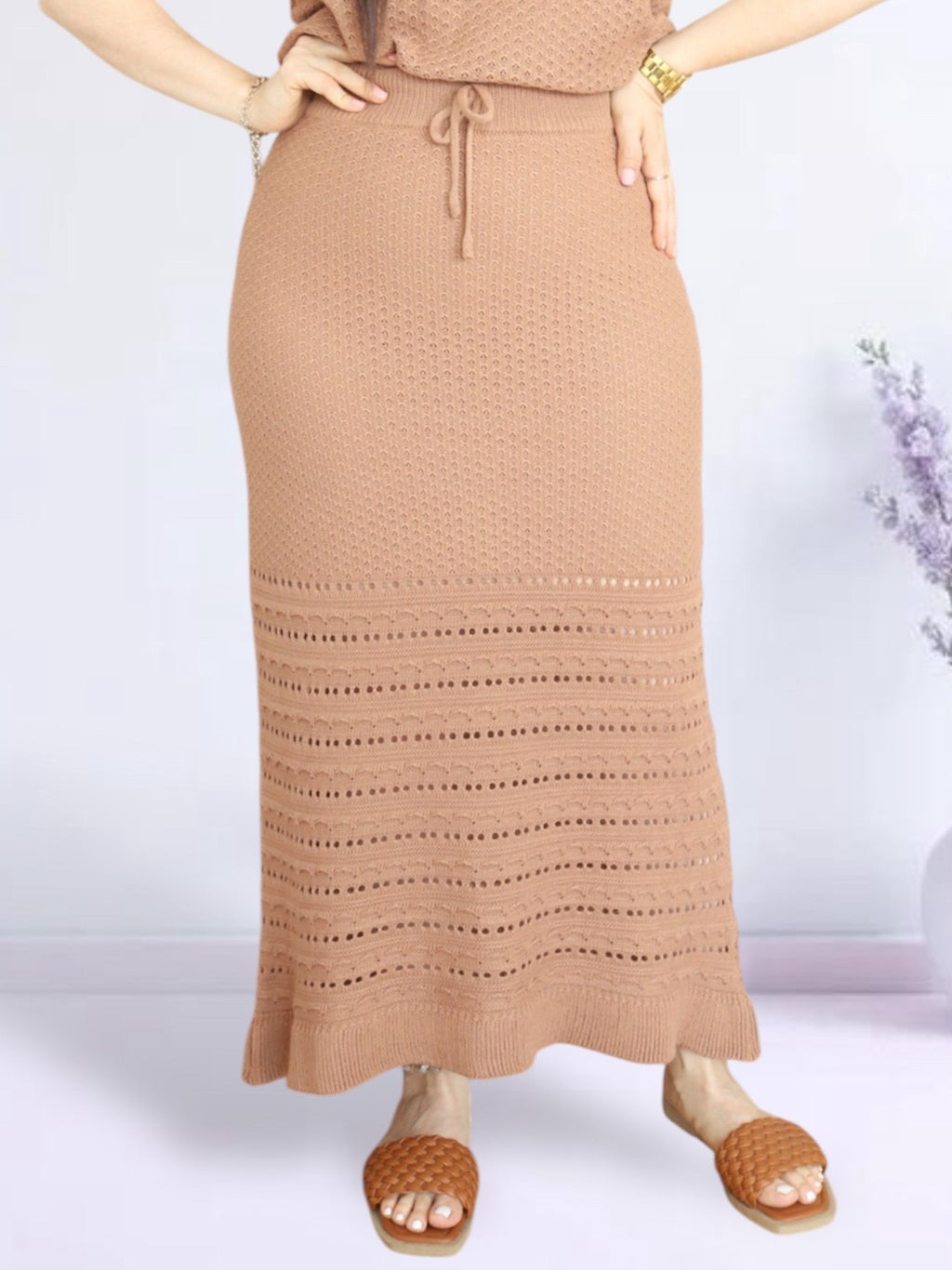 Maxifalda con tejido calado, en hilo tacto algodón sin aberturas. Viene con forro hasta antes de las franjas. Puedes usarla con sandalias planas o de taco, botas, botines, stilettos, mules y zapatillas.