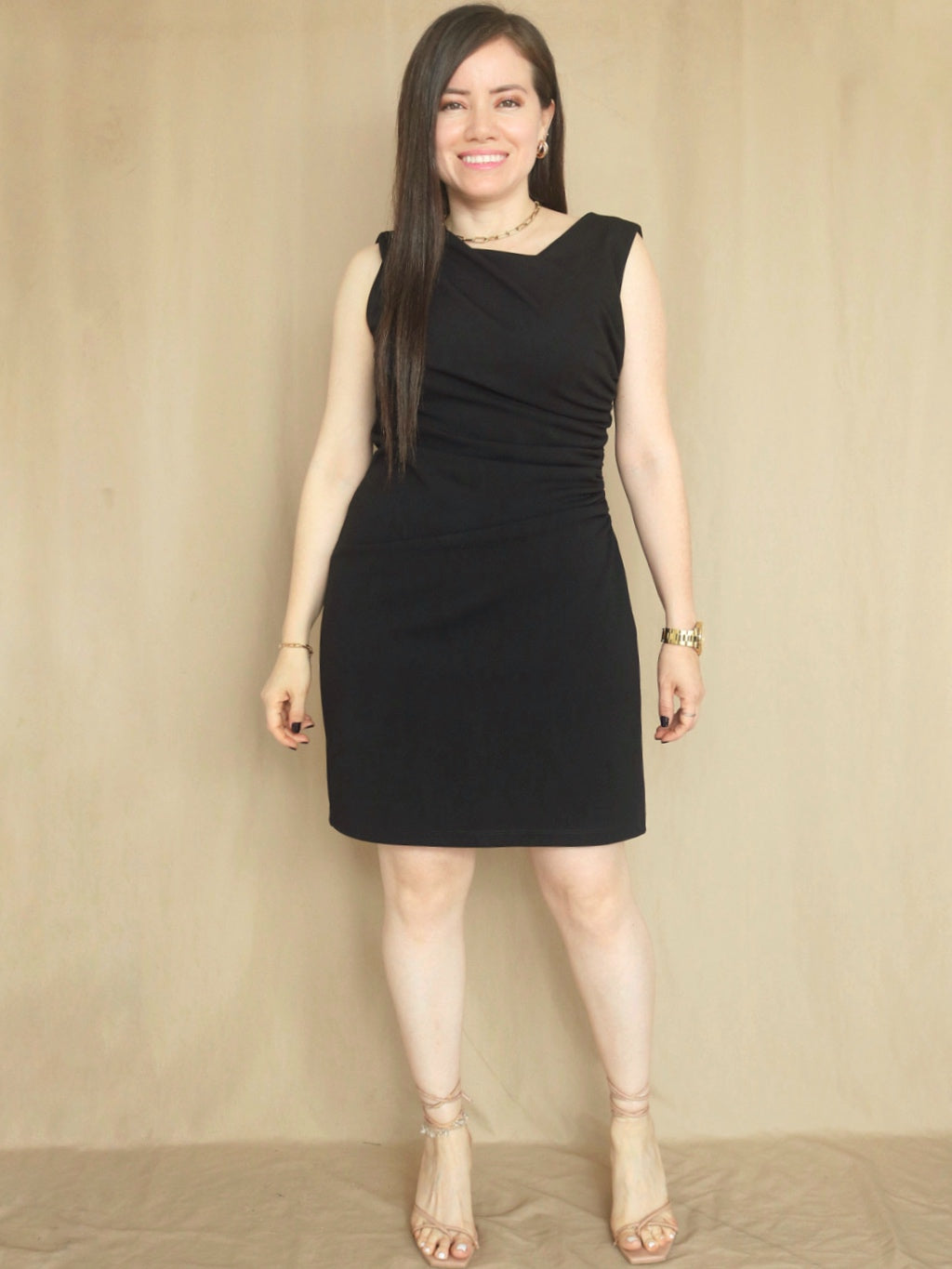Vestido ceñido con forro, con recogido en hombro y detalle de drapeado en cintura que ayuda a marcar más la silueta. Viene con cierre invisible en espalda. Puedes usarlo con sandalias de taco, sandalias planas, stilettos, botines y hasta zapatillas, dependiendo de la ocasión.