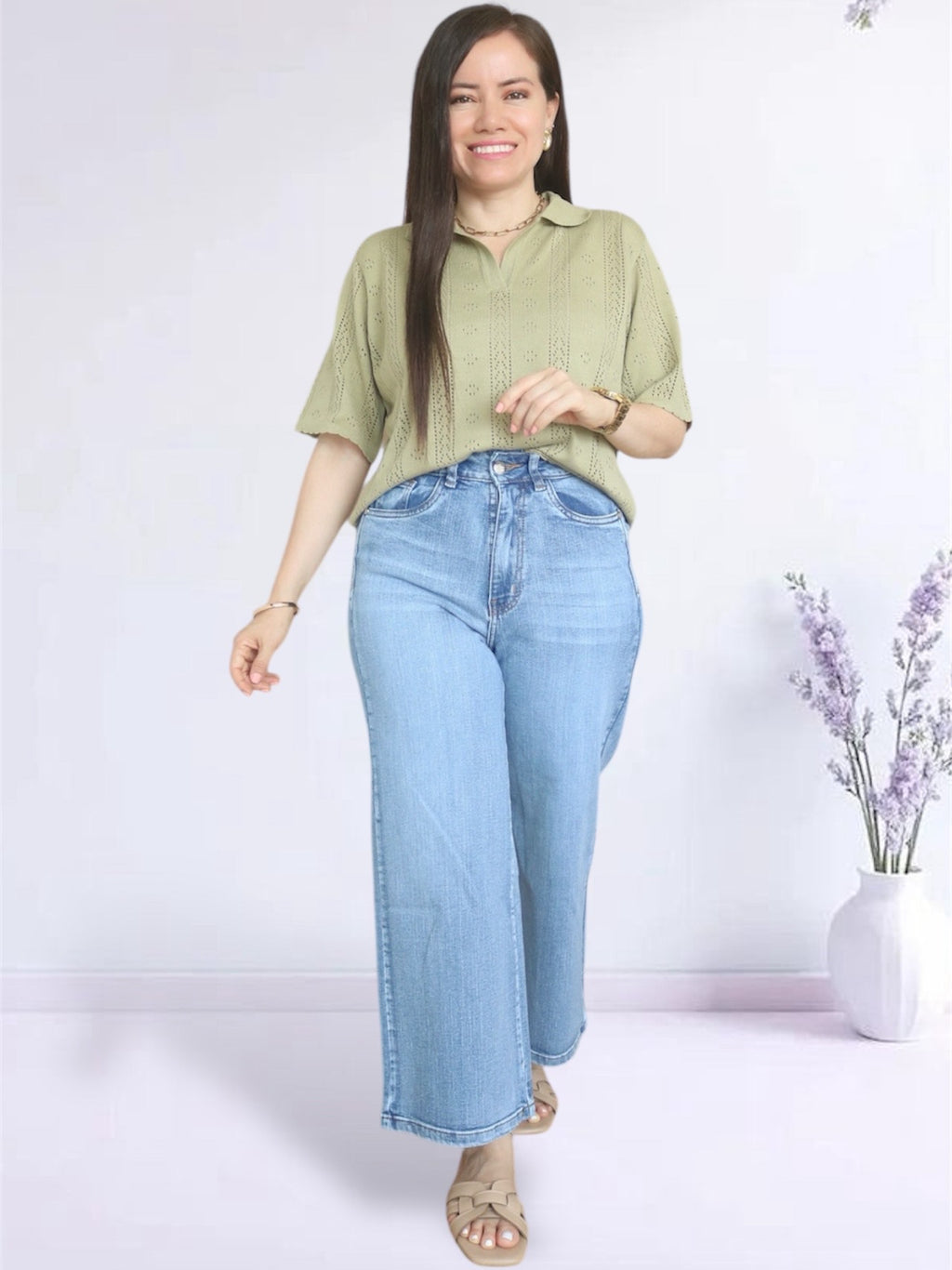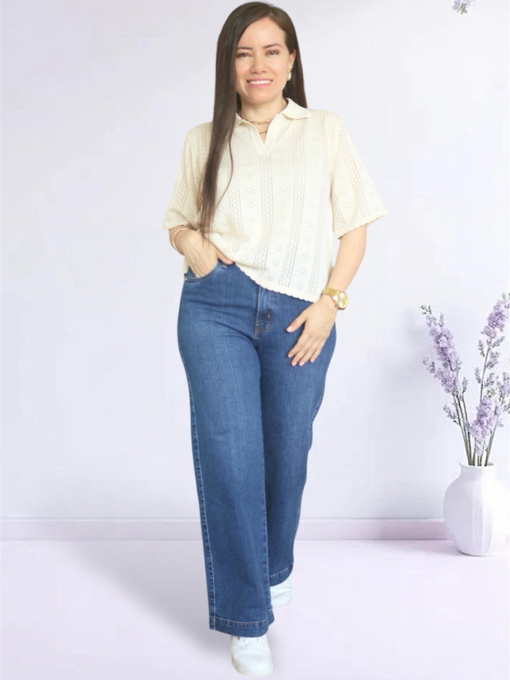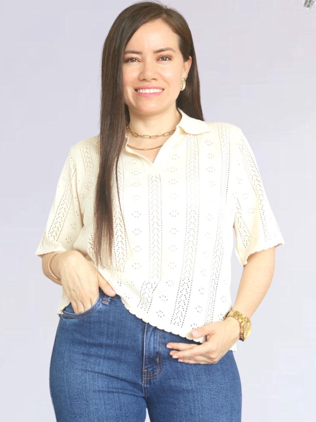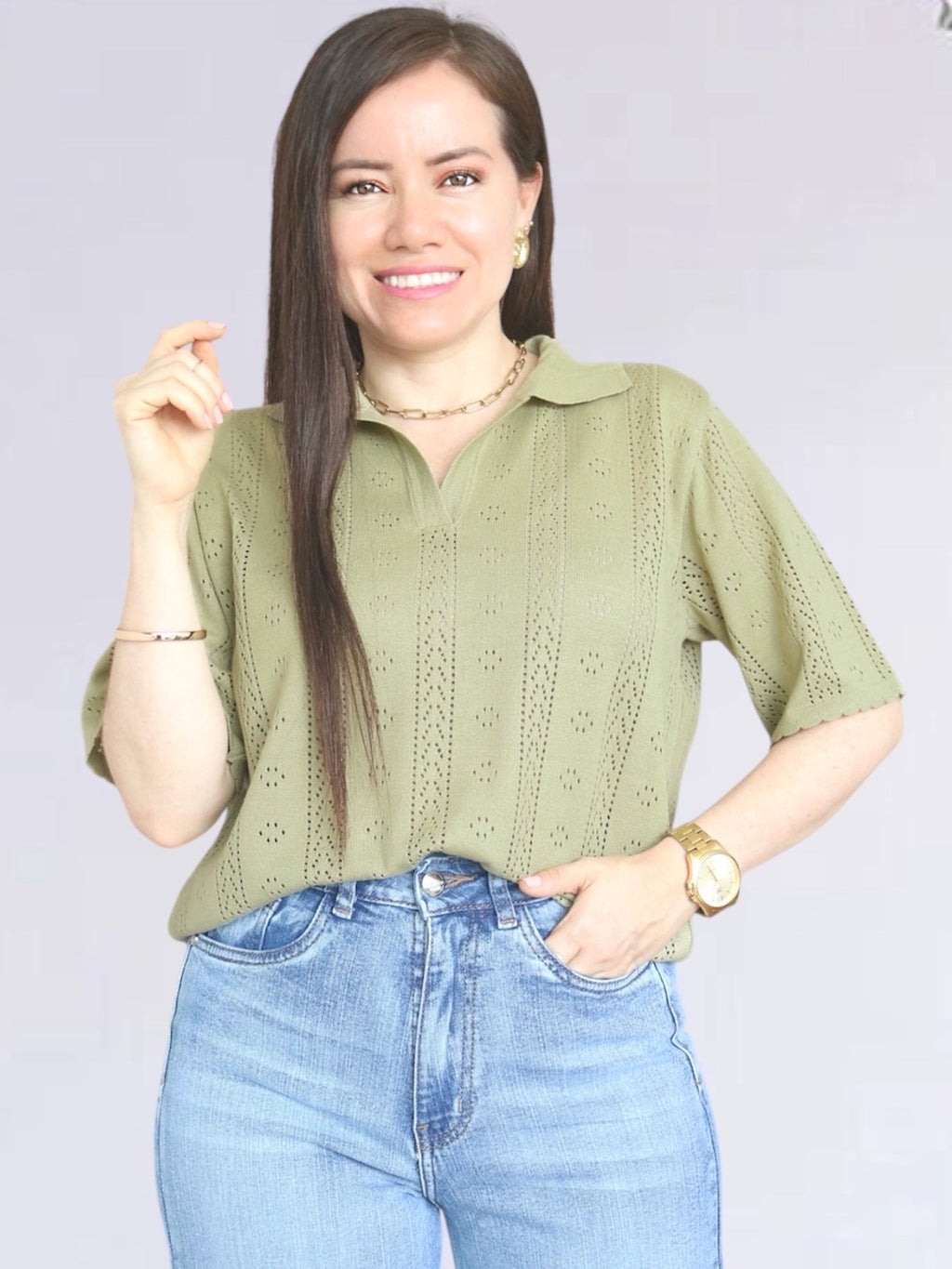 Polo tejido en hilo tacto algodón con tejido punto Jersey con calados, con detalle de cuello camisero y terminado de olas en manga y basta. Puedes combinarla con cualquier falda, short o pantalón.