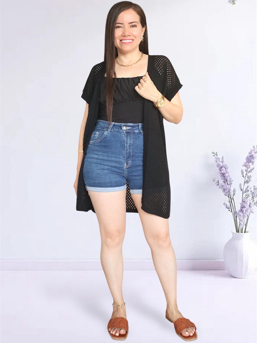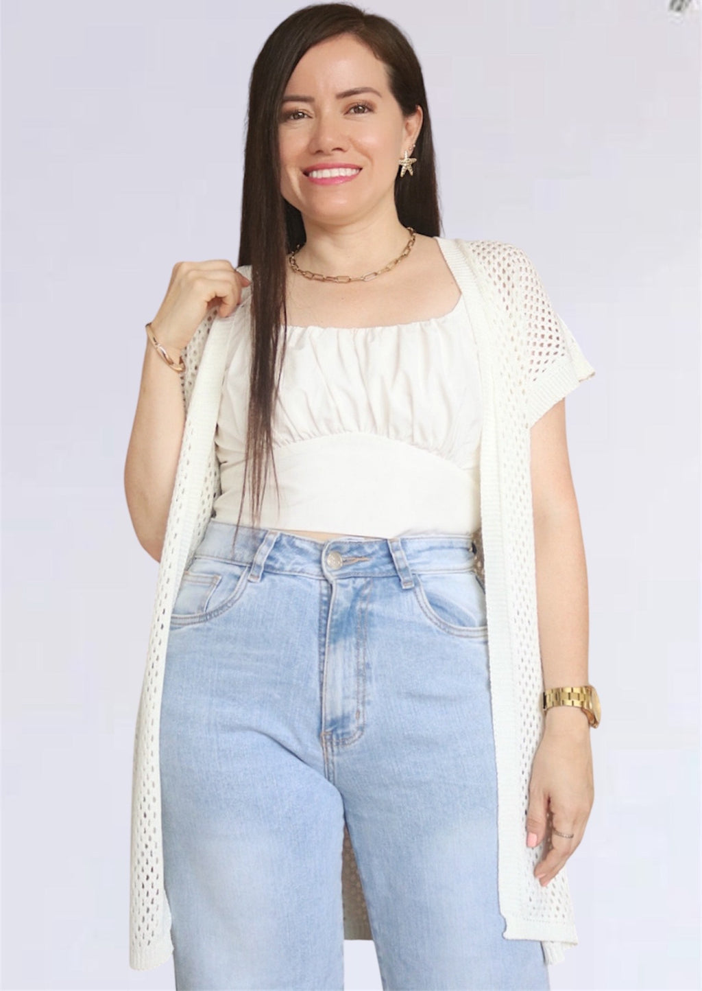 Cardigan tejido en hilo tacto algodón, con detalle de manga cero para poder utilizarlo como complemento perfecto encima de cualquier polo, top o ropa de baño. Abarca desde la talla S hasta la talla L.