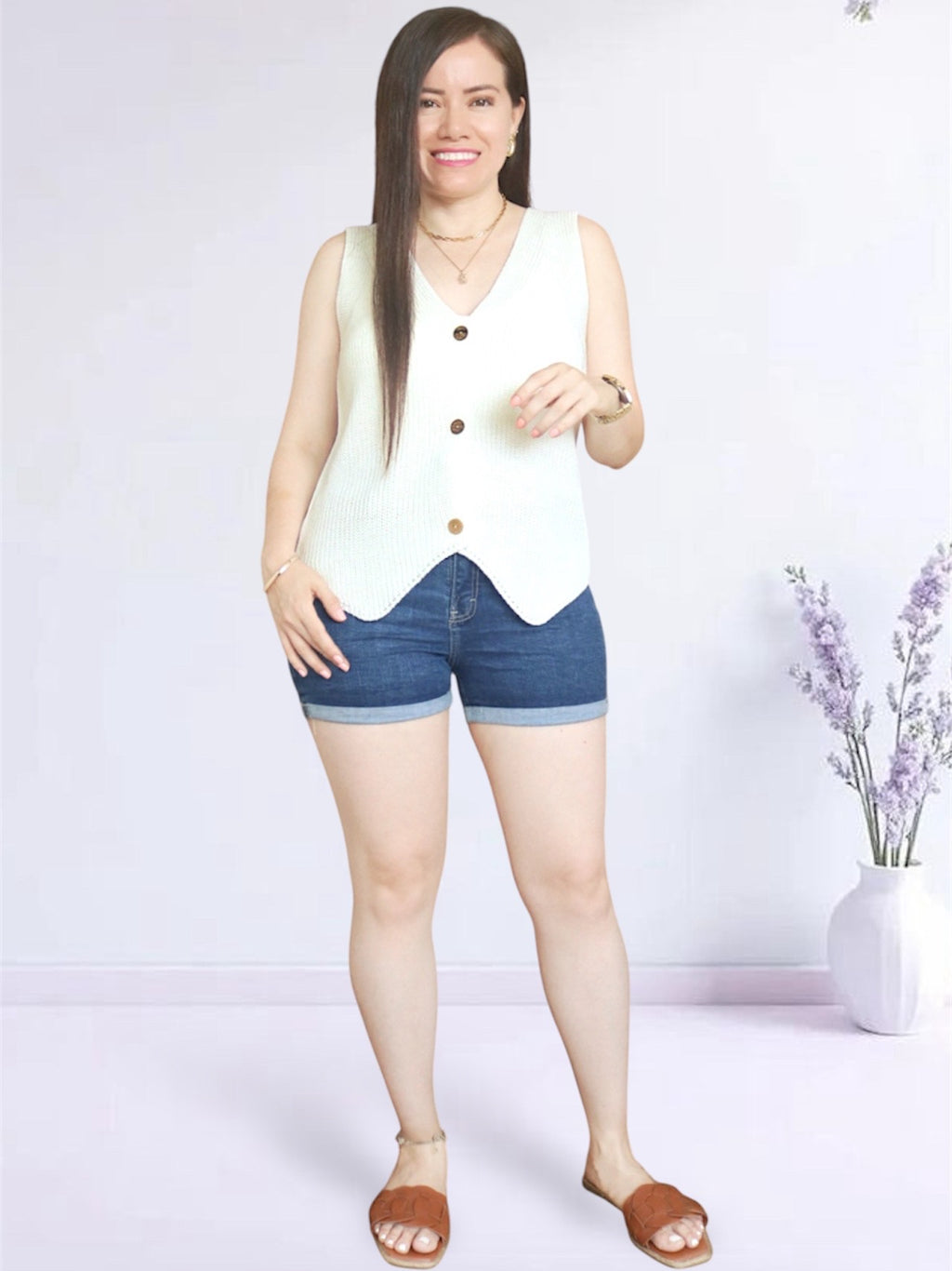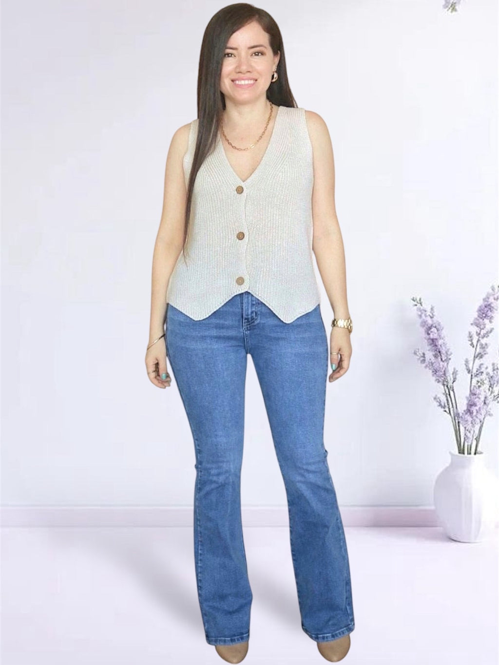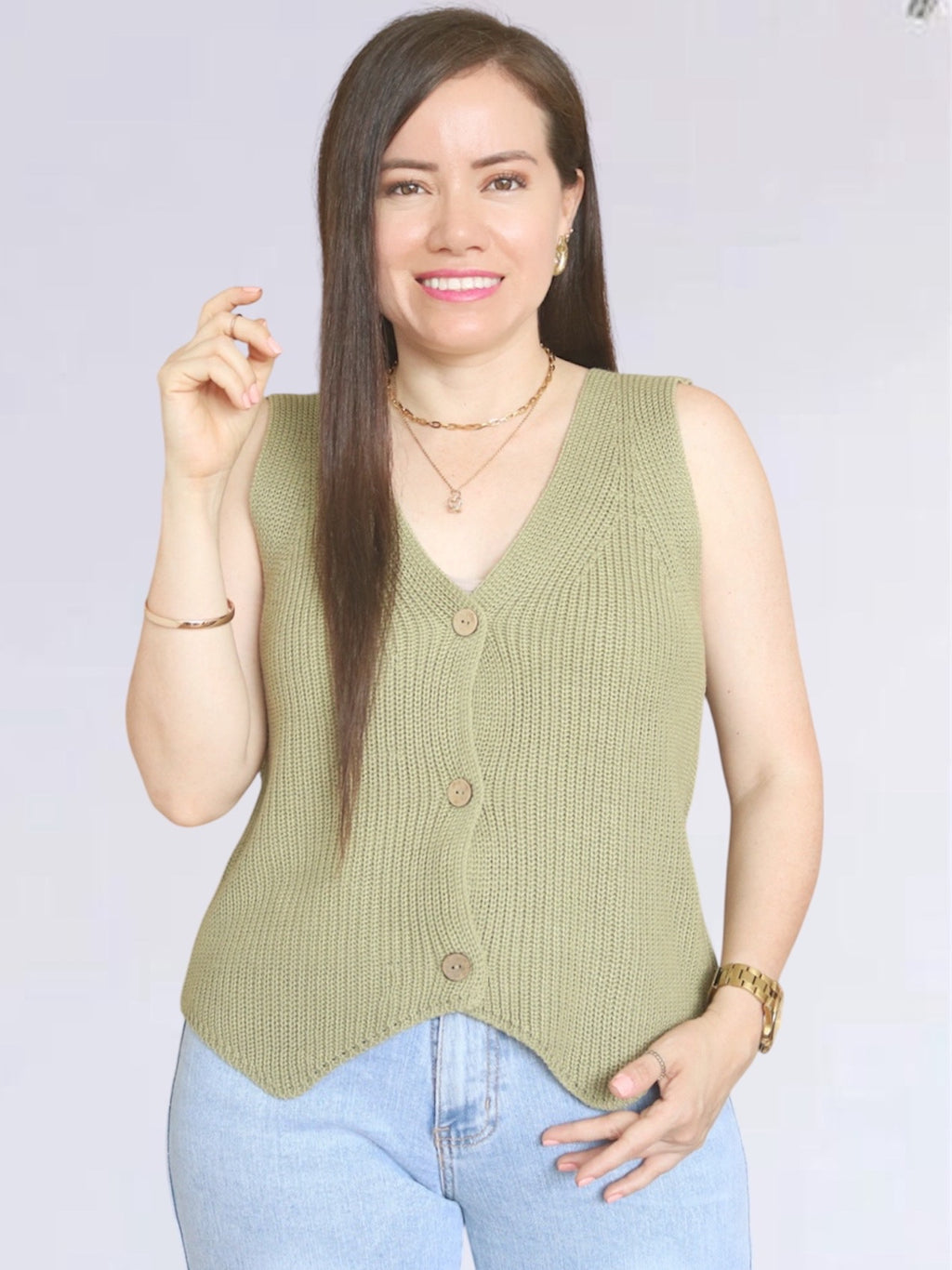 Chaleco de cuello V que será tu complemento perfecto solo o encima de cualquier polo, top o camisa. Por su versatilidad, podrás usarlo para armar looks casuales y elegantes totalmente cerrado o abierto.