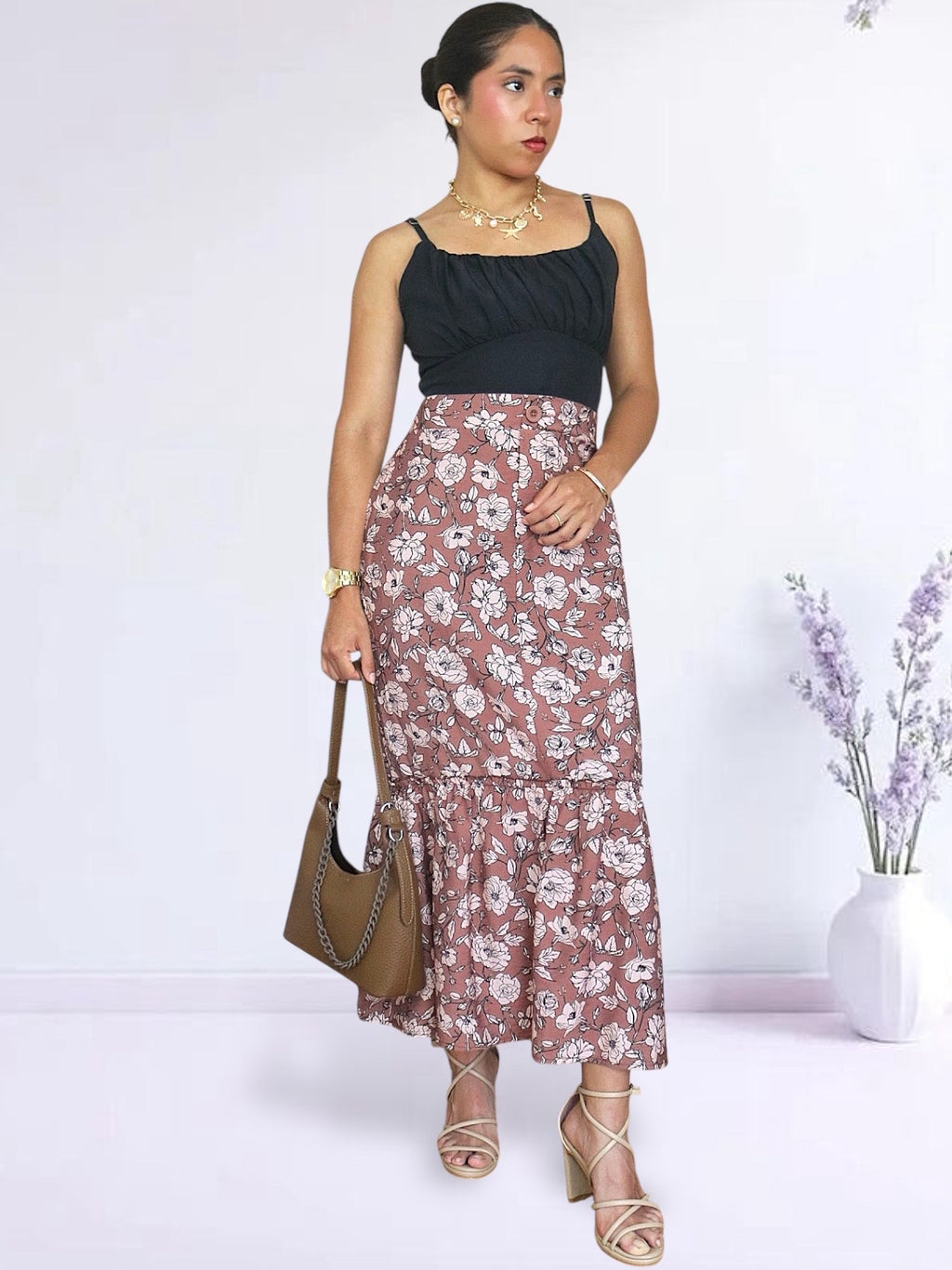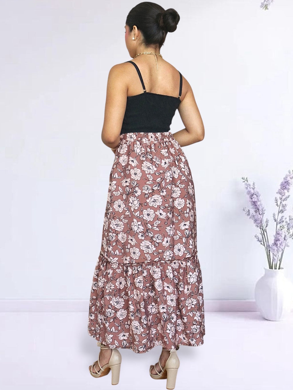 Falda confeccionada en corte A con el detalle de recogido en la parte inferior. Viene con botón y ojal y bolsillos laterales. Cuenta con pretina delgada y plana en la parte delantera y pretina con elástico en la parte posterior. Puedes usarla con sandalias planas o de taco, botas, botines, stilettos, mules y zapatillas.