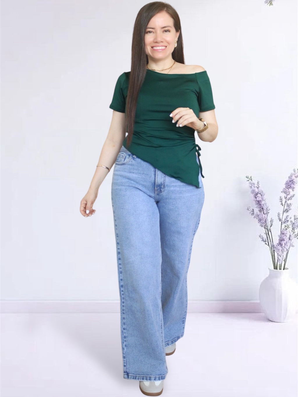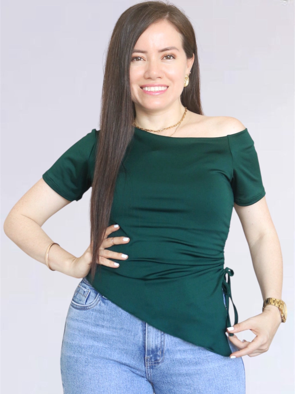 Polo confeccionado en suplex nacional, con cuello asimétrico y cinta reguladora al costado para poder colocarlo a la altura que desees. Se puede usar con el regulador logrando un efecto drapeado o totalmente extendido ingresándolo dentro del pantalón.