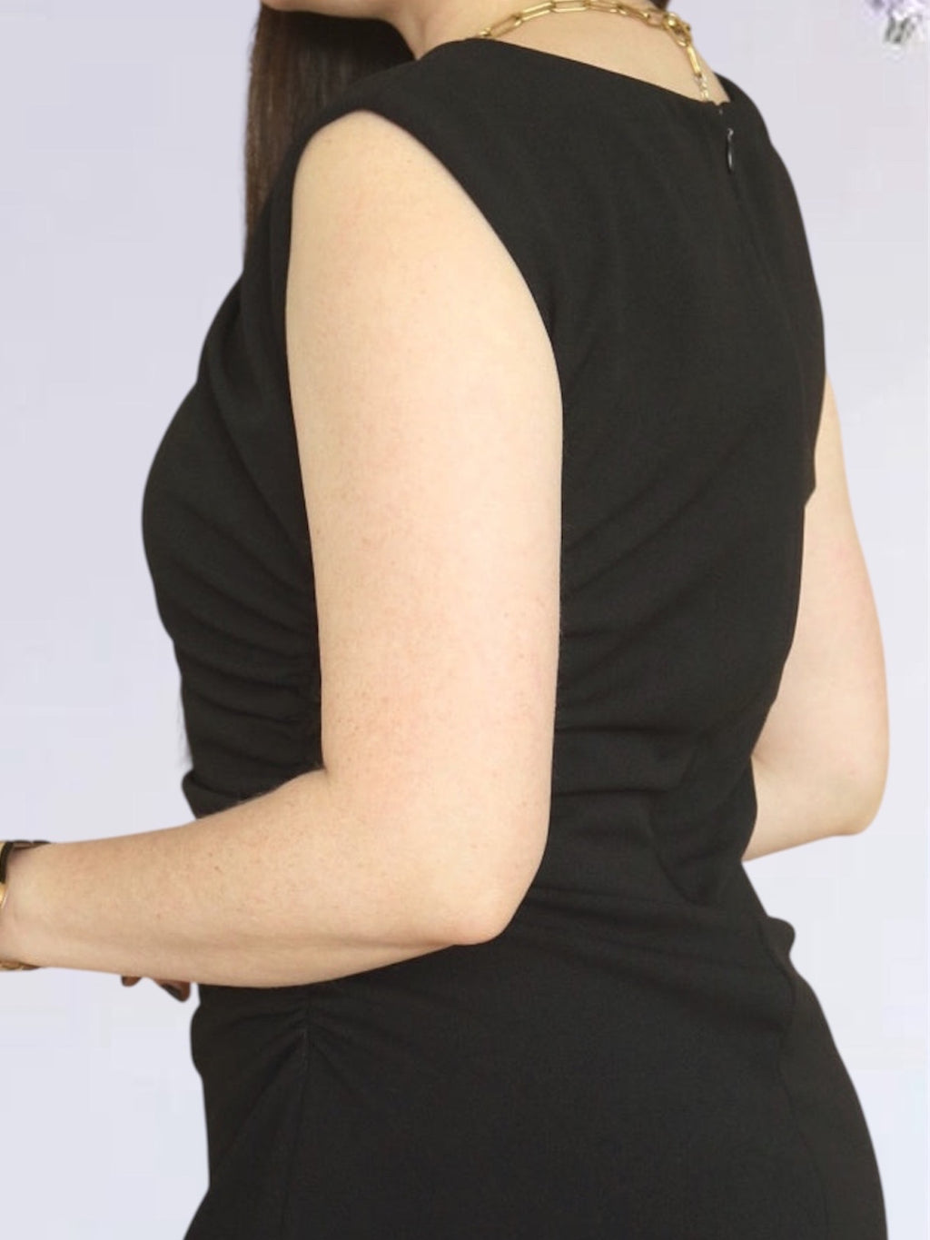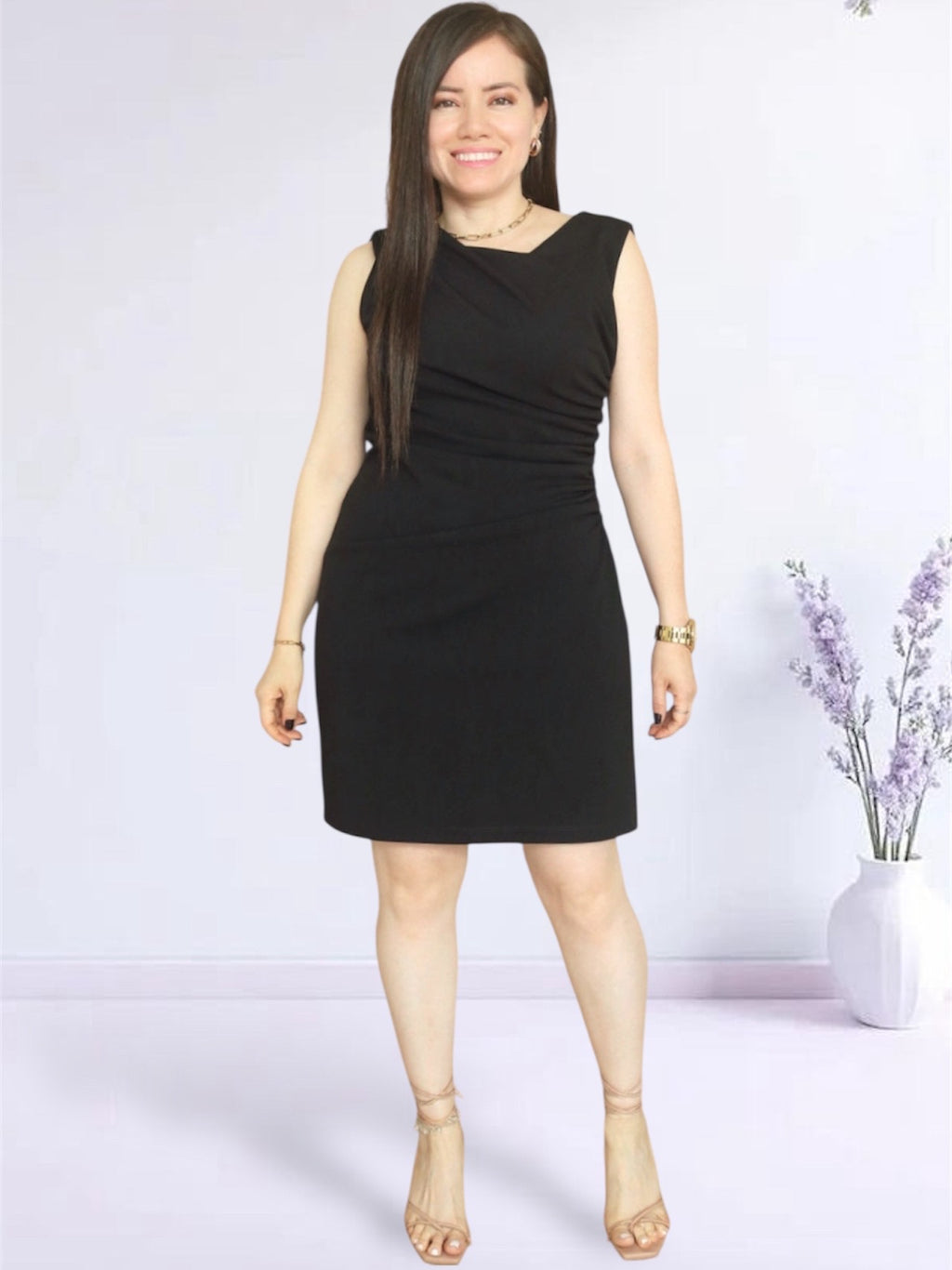Vestido ceñido con forro, con recogido en hombro y detalle de drapeado en cintura que ayuda a marcar más la silueta. Viene con cierre invisible en espalda. Puedes usarlo con sandalias de taco, sandalias planas, stilettos, botines y hasta zapatillas, dependiendo de la ocasión.