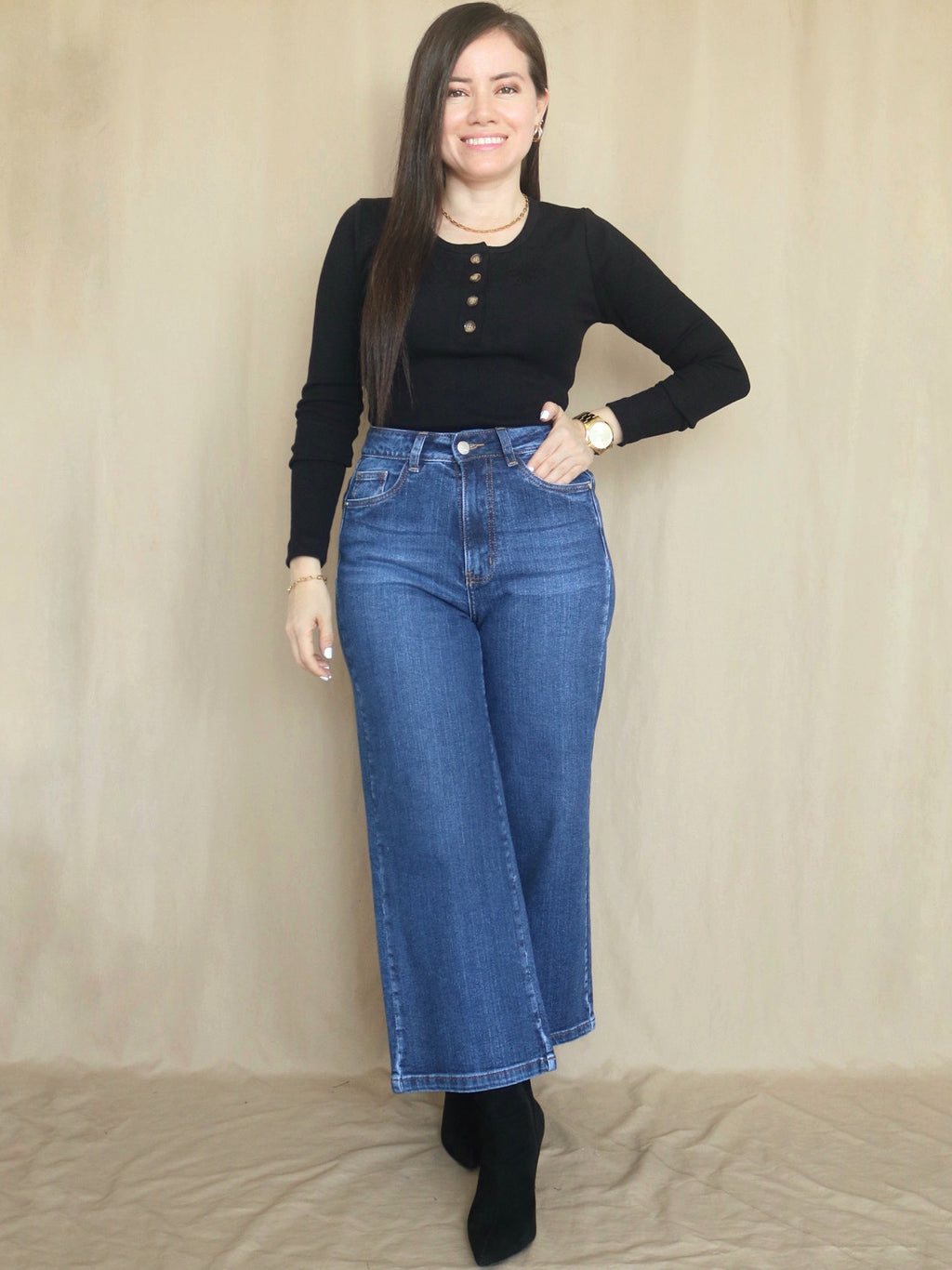 Pantalón elaborado en denim semi estretch. De tiro súper alto, con pinzas posteriores, además de cierre y bolsillos reales delanteros y posteriores.
