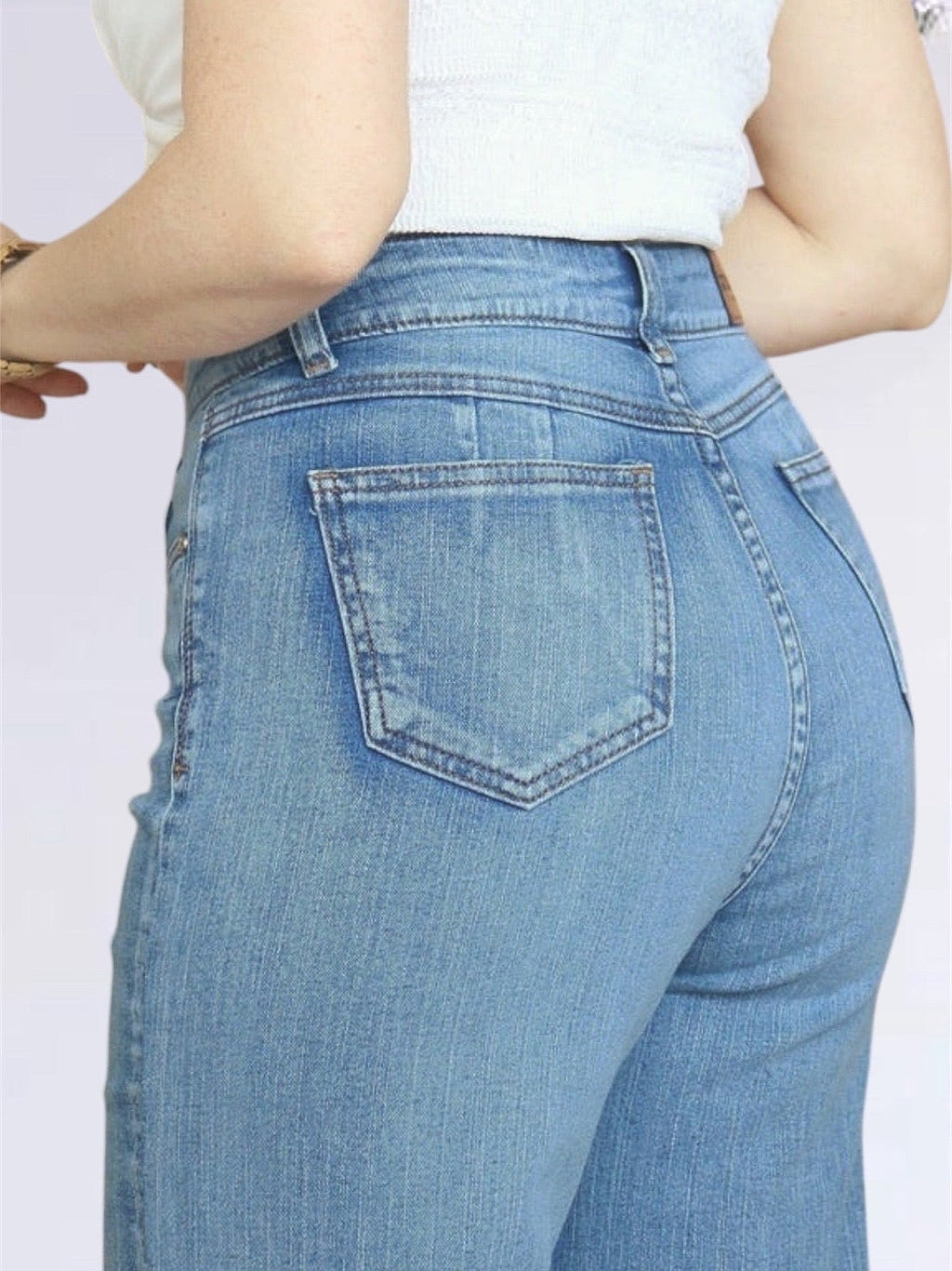 Pantalón elaborado en denim semi estretch. De tiro súper alto, con pinzas posteriores, además de cierre y bolsillos reales delanteros y posteriores.